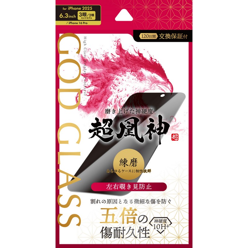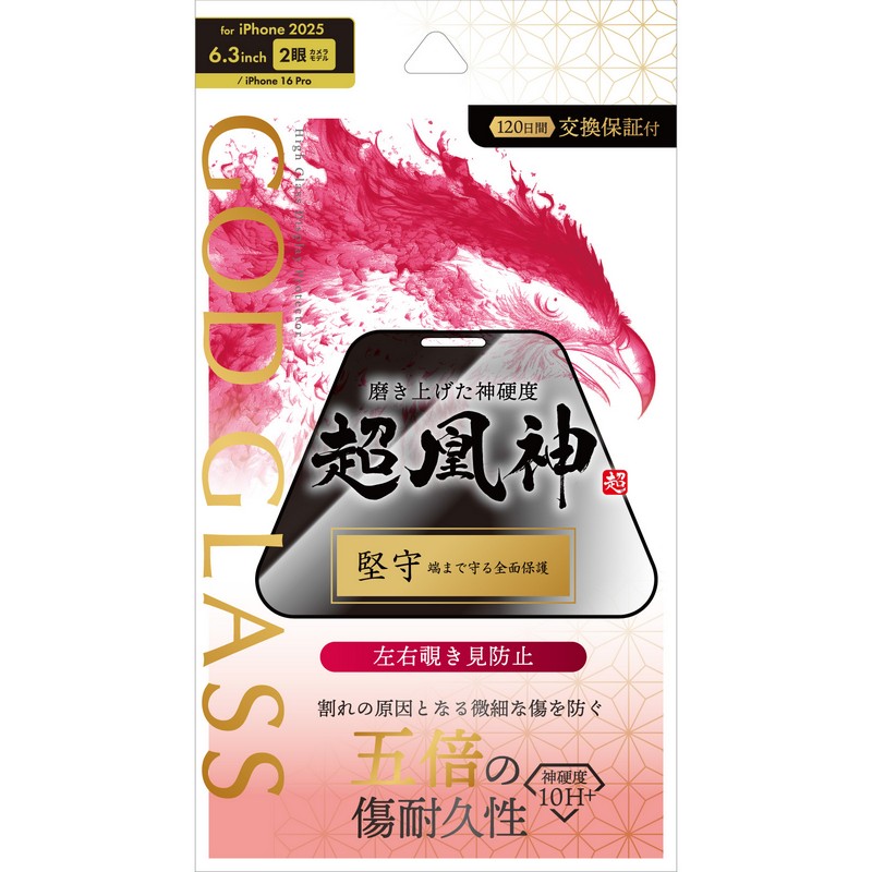 iPhone 17/iPhone 16 Pro ガラスフィルム 「GOD GLASS 超凰神」堅守 覗き見防止180° JAN:4582698118756 型番:GG-IM25GFN カラー: