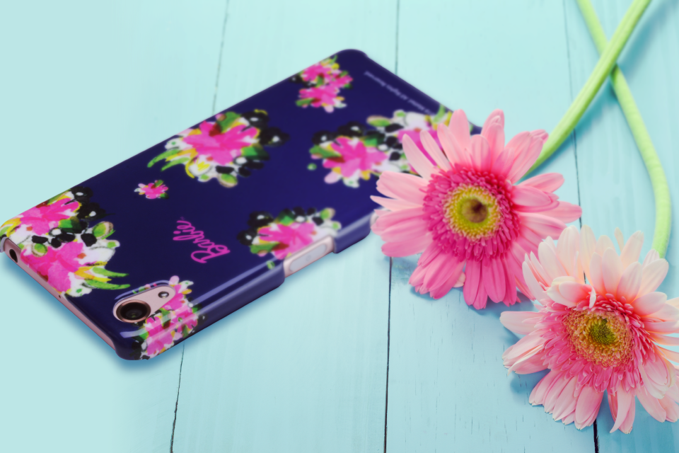 Barbieのロゴとエレガントな水彩画がプリントされたケースは大人な女性も楽しめるクラシカルテイスト。 ビビットなブルーとピンク、美しいホワイトを基調にした"大人バービーテイスト"です。