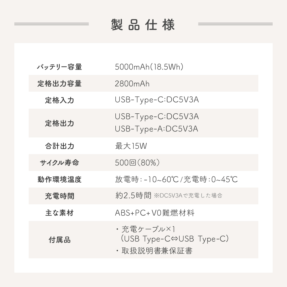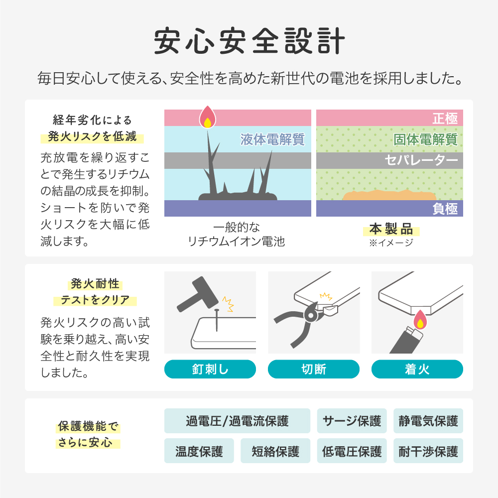 2025.12.16 半固体モバイルバッテリー「MOEZ(モエズ)」5000mAh を発売いたします。 ・半固体電池を採用した安心安全 ・コンパクトで持ち運びやすいサイズ ・USB Type-C&Aの2ポート搭載 ・最大出力15W ・バッテリー残量ランプ搭載 ・電気用品安全法(PSE)の技術基準に適合 付属品:充電ケーブル(USB Type-C to C)、取扱説明書兼保証書 製品詳細は以下の製品ページよりご覧ください。 ダークグレー ホワイト グレージュ ブルー ピンク 製品ページ LEPLUS NEXT 公式サイト ご購入はこちら MOEZ 製品ページ LEPLUS NEXT 公式サイト ご購入はこちら