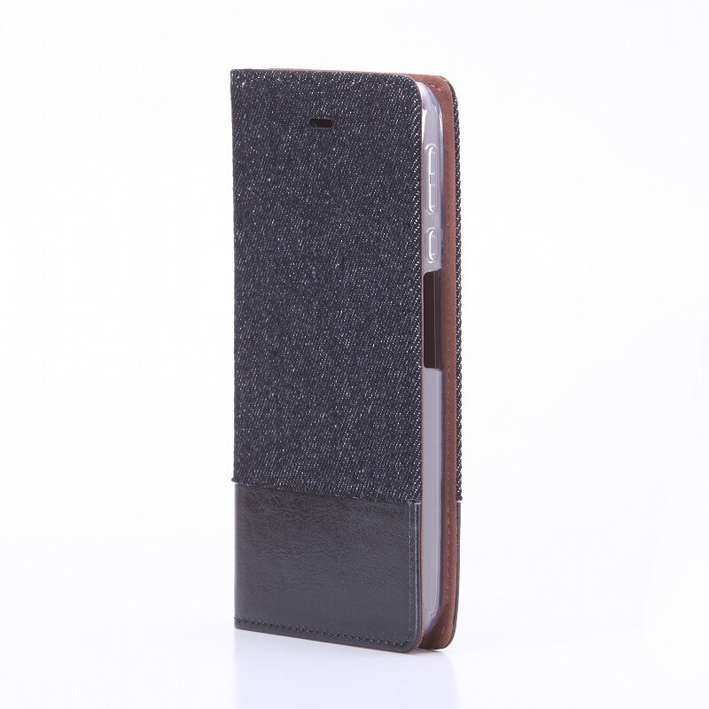 素材(デニム+PU)を組み合わせた、手触り・見た目も抜群のデザインブックケース。動画視聴に最適なスタンド機能/カード収納:3枚/閉じたまま通話可能/ストラップホール付/オートスリープ機能対応