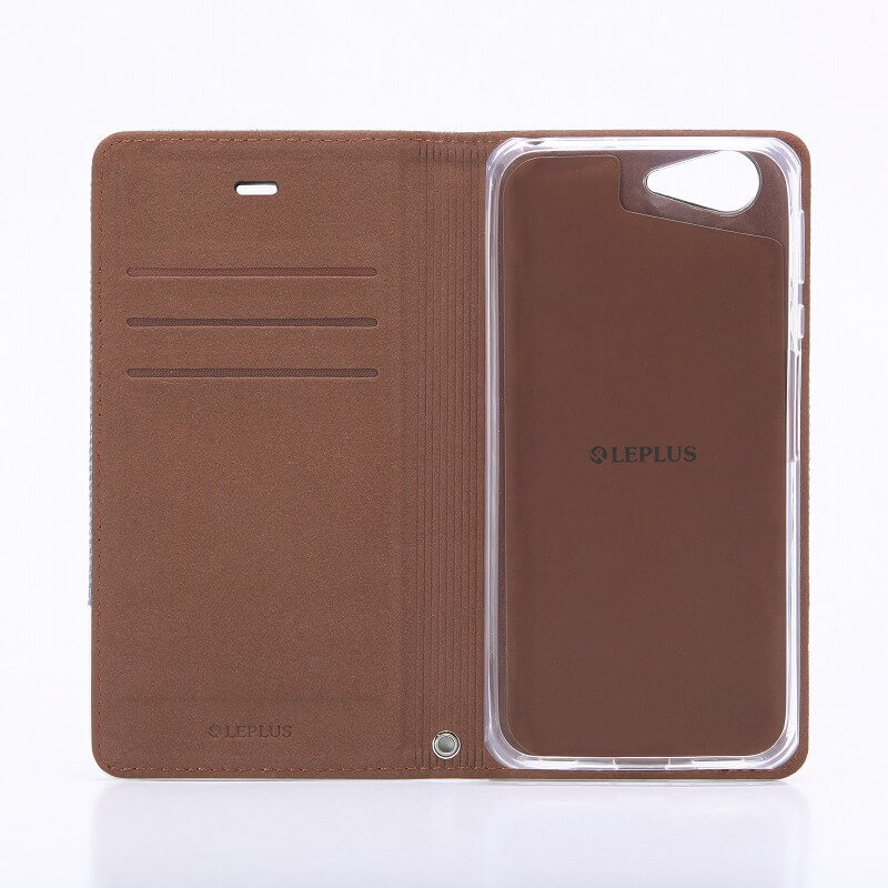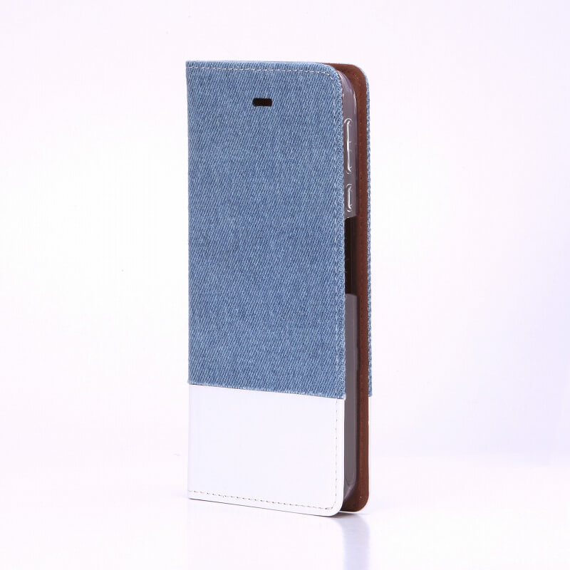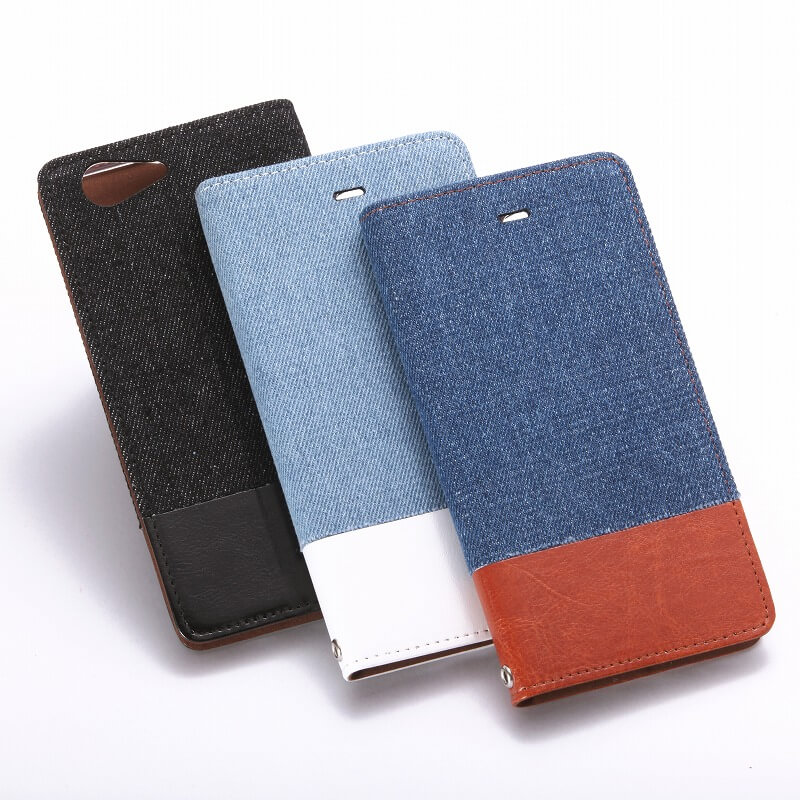 素材(デニム+PU)を組み合わせた、手触り・見た目も抜群のデザインブックケース。動画視聴に最適なスタンド機能/カード収納:3枚/閉じたまま通話可能/ストラップホール付/オートスリープ機能対応
