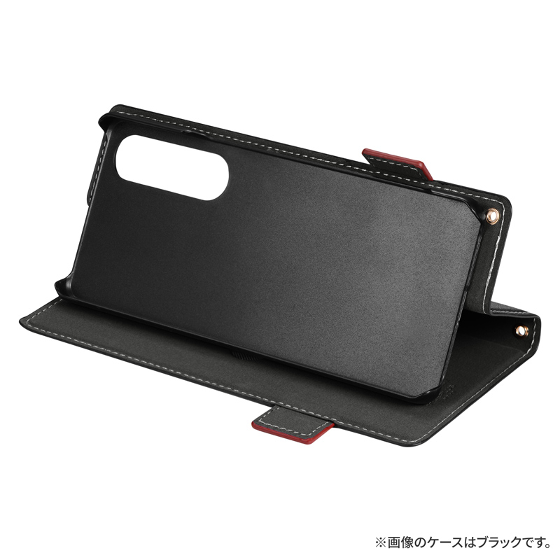 サイドベルトがバイカラーになった遊び心ある手帳型ケース/ピタッと固定できるマグネット仕様/すぐ取り出せて嵩張らないカード収納ポケット(1枚)/動画視聴に最適なスタンド機能/ショルダーストラップが使える2つのホール搭載