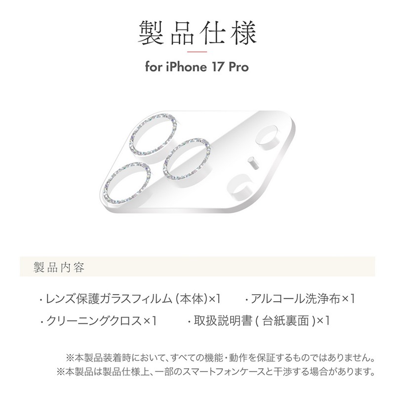 php // $web_item_description = wp_strip_all_tags( $web_item_description ); echo $web_item_description; ?> カメラ全体を保護するガラスフィルム/カメラレンズに個性と輝きを与えるラメ入りデザイン/驚異的な透過率約92%/アルコール洗浄布・クリーニングクロス付属