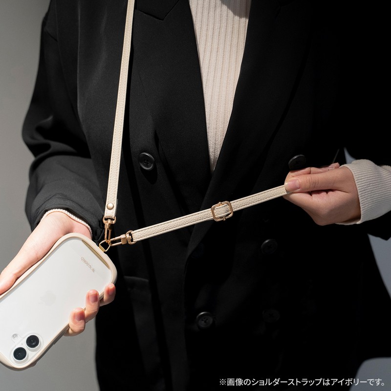 端末やケースを選ばず装着できるスマホショルダーストラップ/端末背面を邪魔しない、細身で頑丈なステンレス製挟み込みシート付属/長さ調整可能/厚みのある上質なシボ調PUレザー/ねじれにくいWフック/高級感あるマットパーツ/日常使いしやすいカラバリ