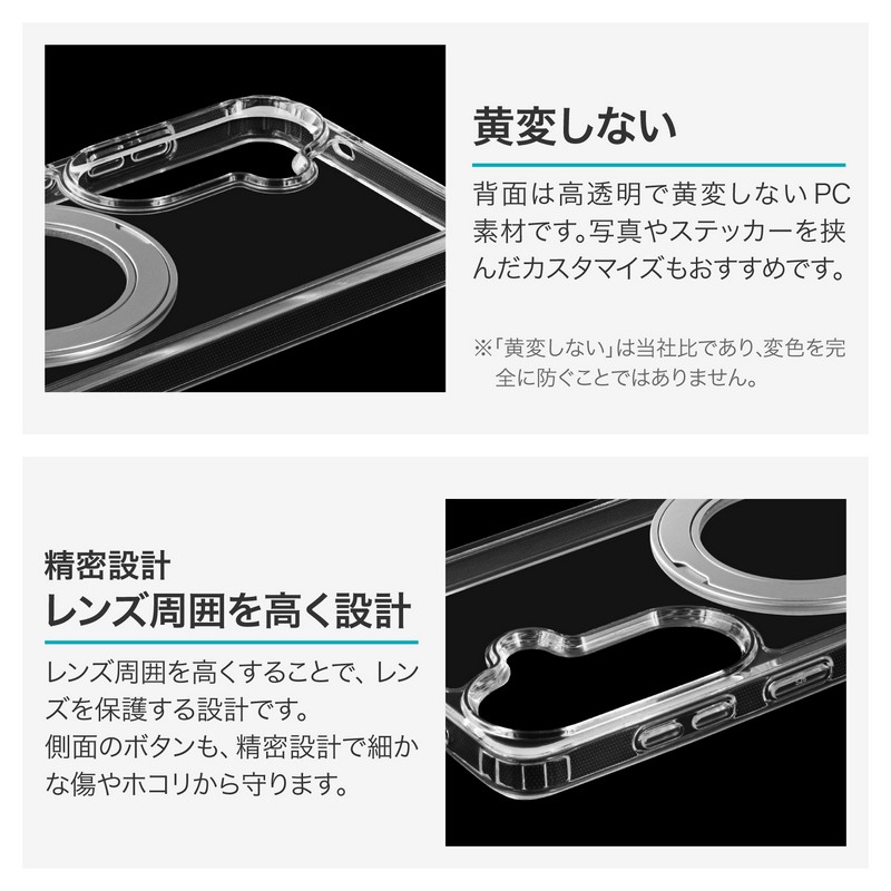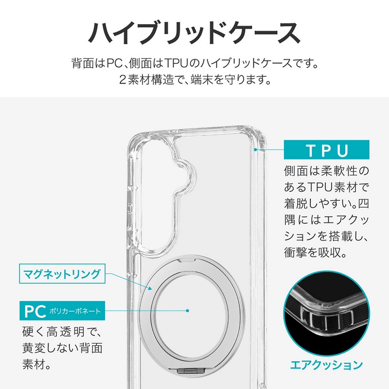 php // $web_item_description = wp_strip_all_tags( $web_item_description ); echo $web_item_description; ?> 【耐衝撃】360度回転&スタンドになるリングを搭載/磁気アクセサリ対応/硬く高透明なポリカーボネートと、柔らかく耐衝撃性に優れたTPUのハイブリッドケース/角に衝撃を吸収するエアクッションを搭載/柔軟性があり着脱が簡単/ボタンやカメラレンズ周りを保護/ストラップホール搭載